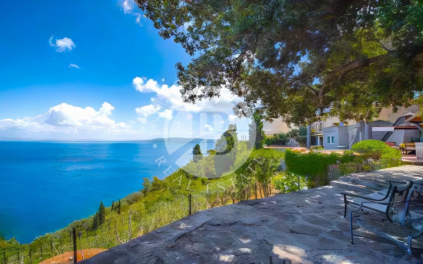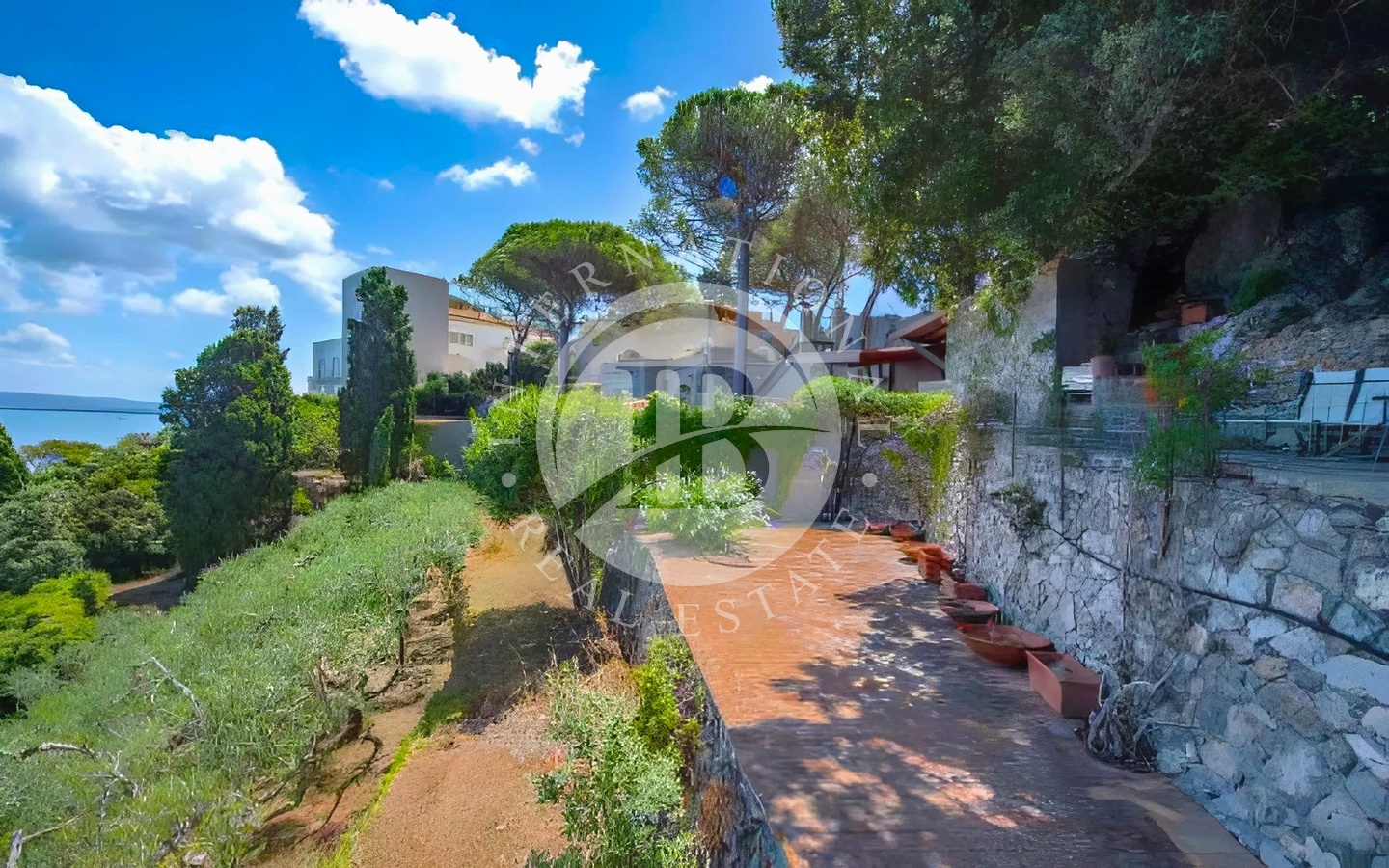 Tutti gli ambienti si affacciano sul giardino e godono di una vista aperta sul mare, creando una continuità naturale tra interno ed esterno. Una stanza multifunzionale con bagno, attualmente destinata al personale, collega direttamente al garage.