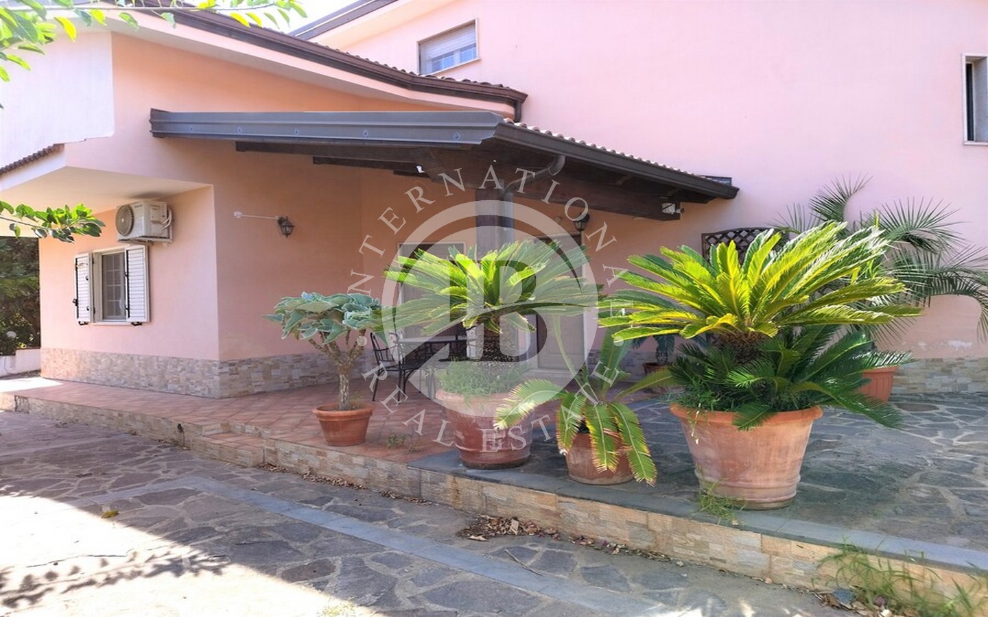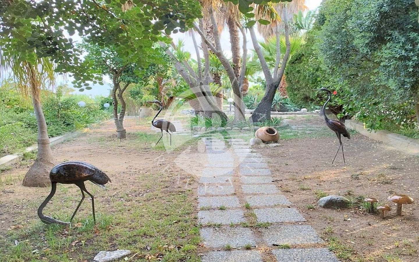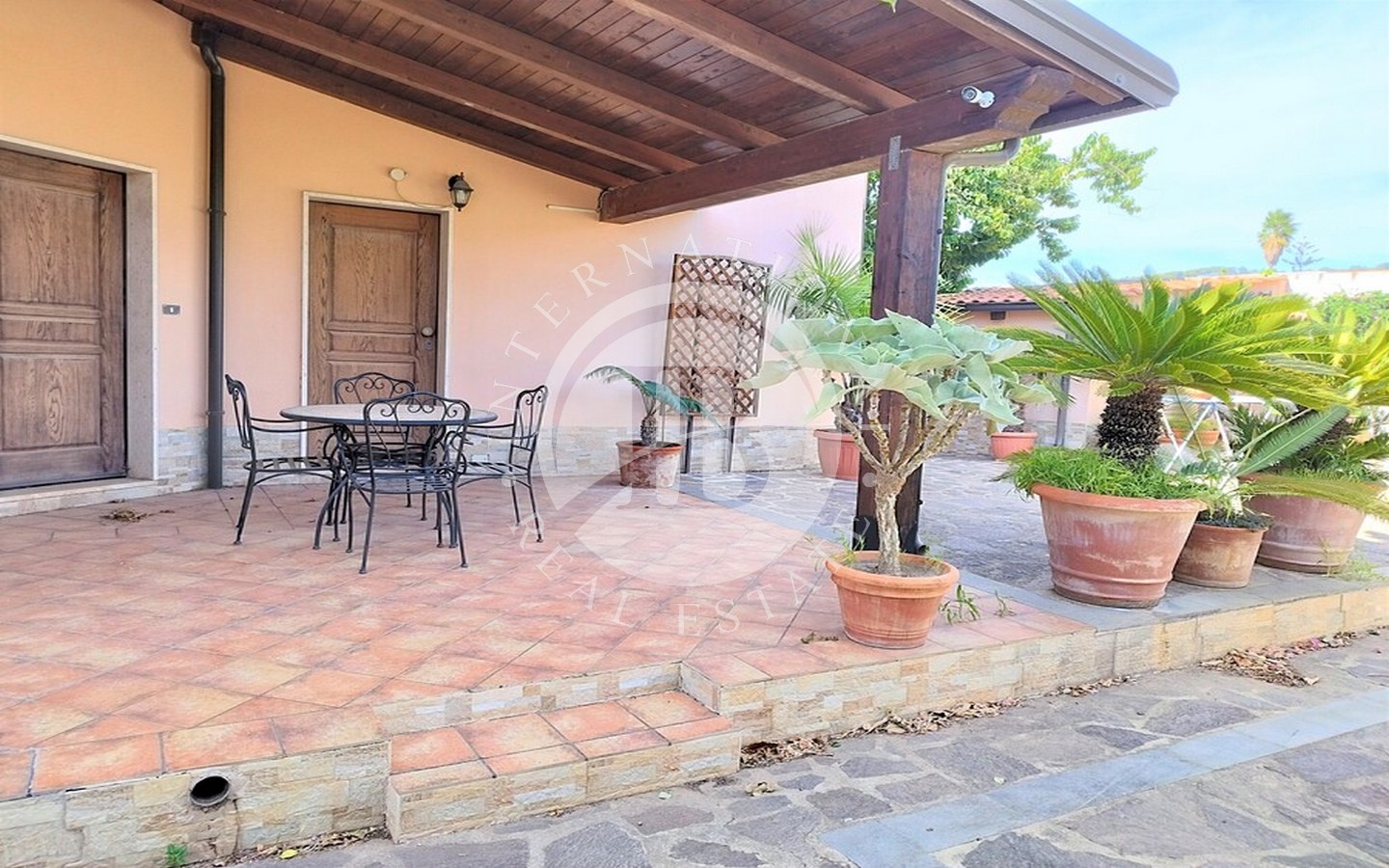 All'esterno, la villa vanta un terzo bagno, un cucinino, una piccola lavanderia e due magazzini. Il giardino circostante è arricchito da numerose piante esotiche, tropicali e ornamentali, insieme a alberi di agrumi e fruttiferi. La pavimentazione in porfido e pietra lavica dell'Etna crea un ambiente raffinato e accogliente.