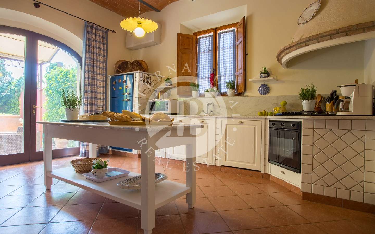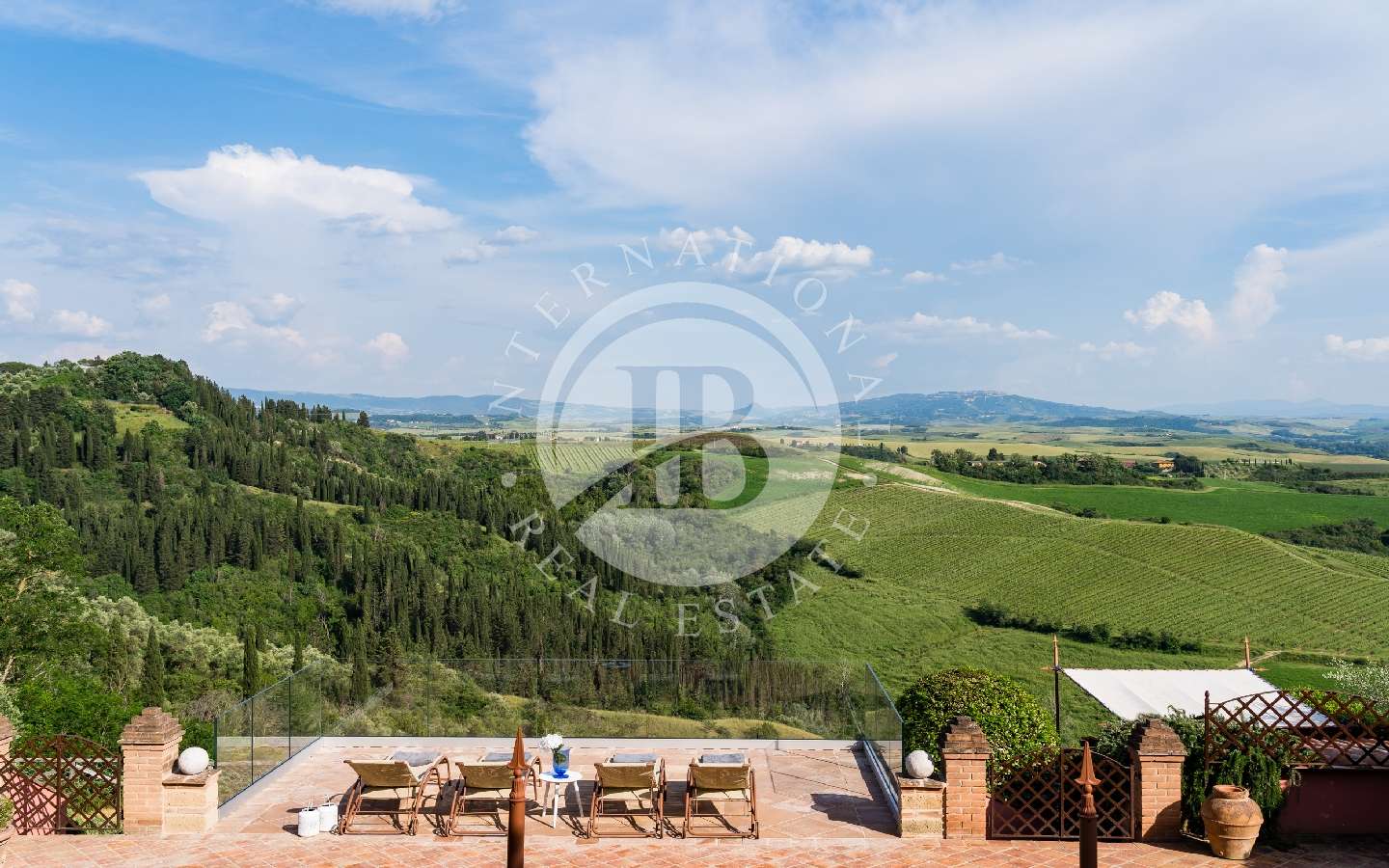 Da questo luogo, è possibile ammirare uno spettacolare scenario ricco di vigneti e colline che si estendono fino alla meravigliosa città di Volterra. Utilizzando una piccola scala in mattoni, si scende al sottostante giardino, caratterizzato da un maestoso tiglio. Al di là di questo giardino, protetta da un muro in tufo che garantisce assoluta privacy, si erge la piscina in posizione dominante, con acqua salata (dimensioni 12 x 4 x 1,30 metri con zona relax ad idromassaggio). La piscina è attrezzata con lettini, ombrelloni, e altro. Il terreno incluso nella vendita misura circa 6 ettari.