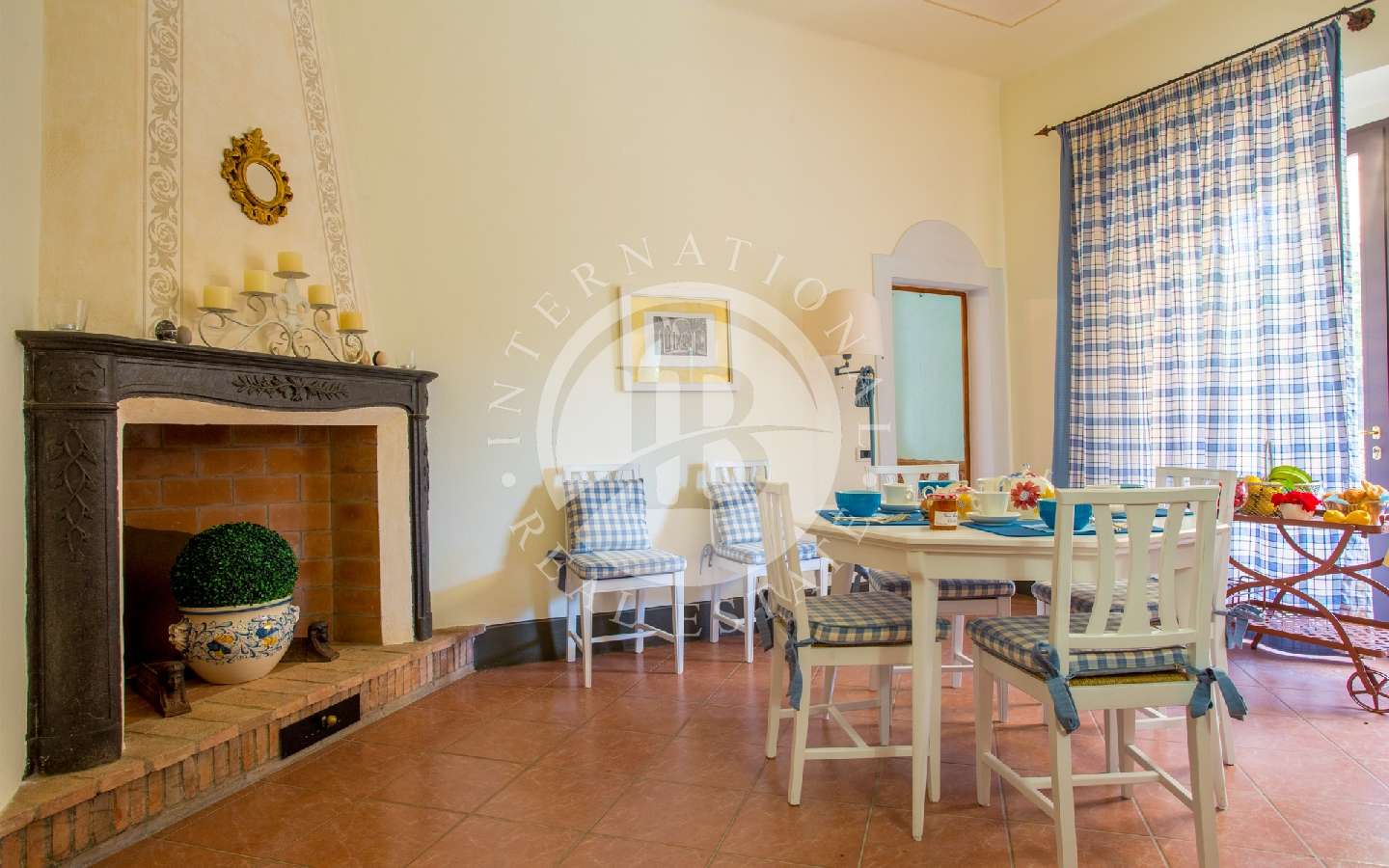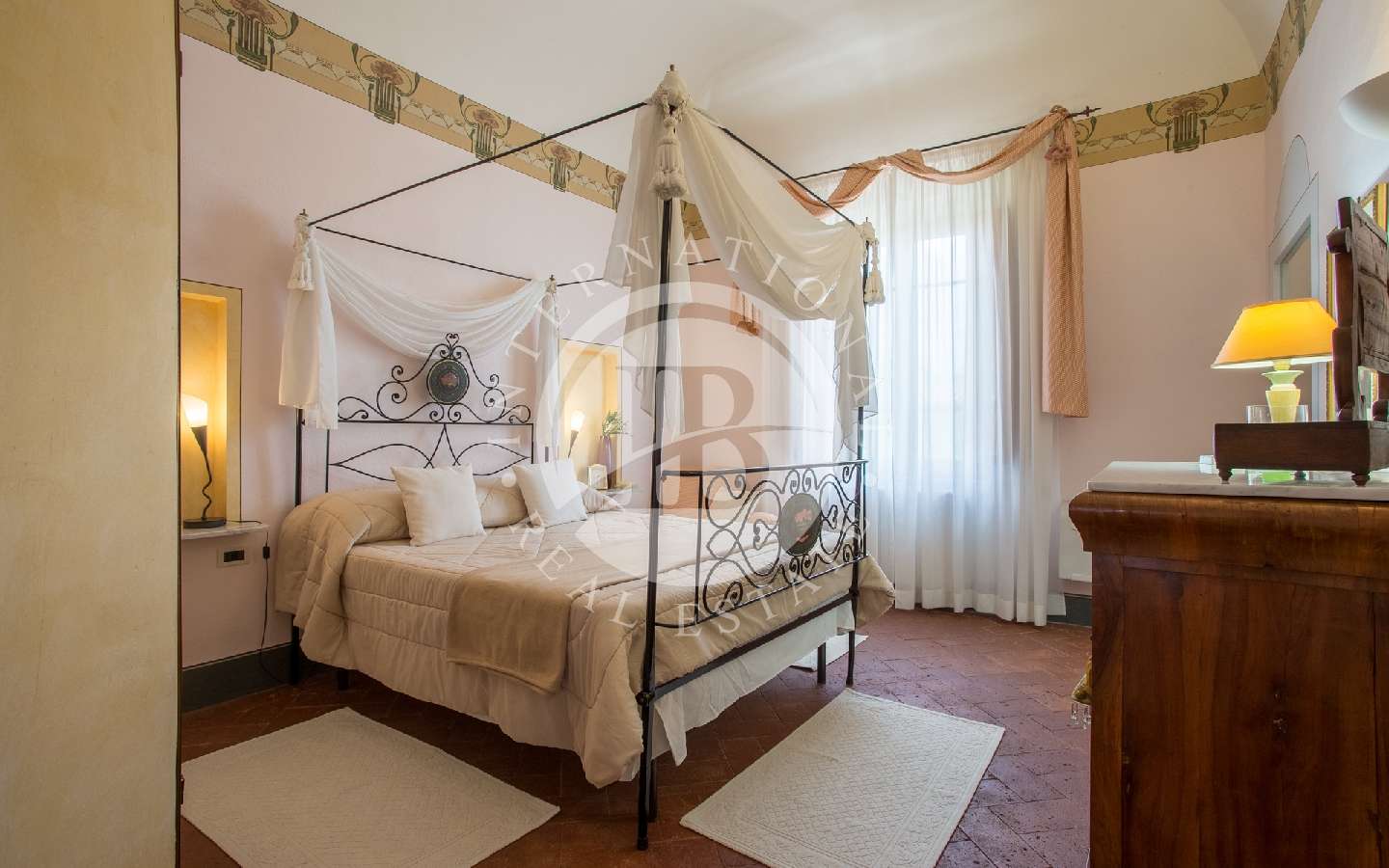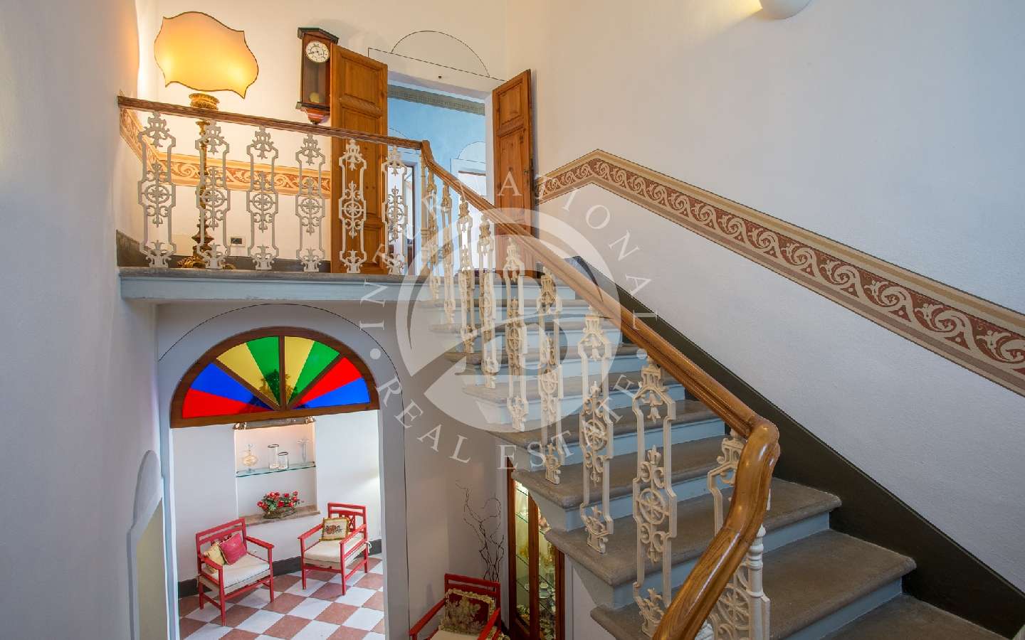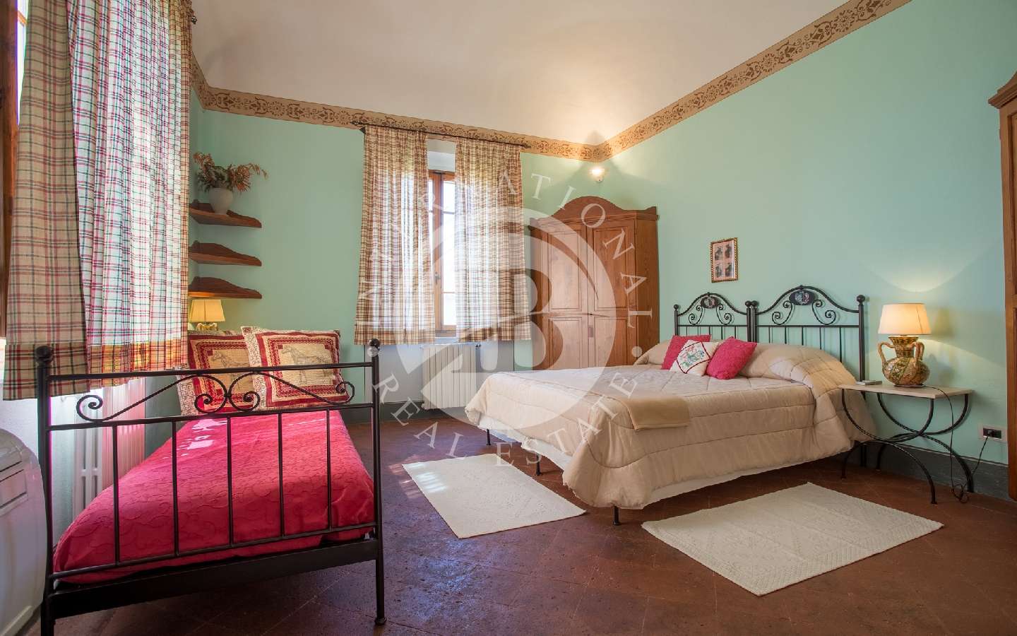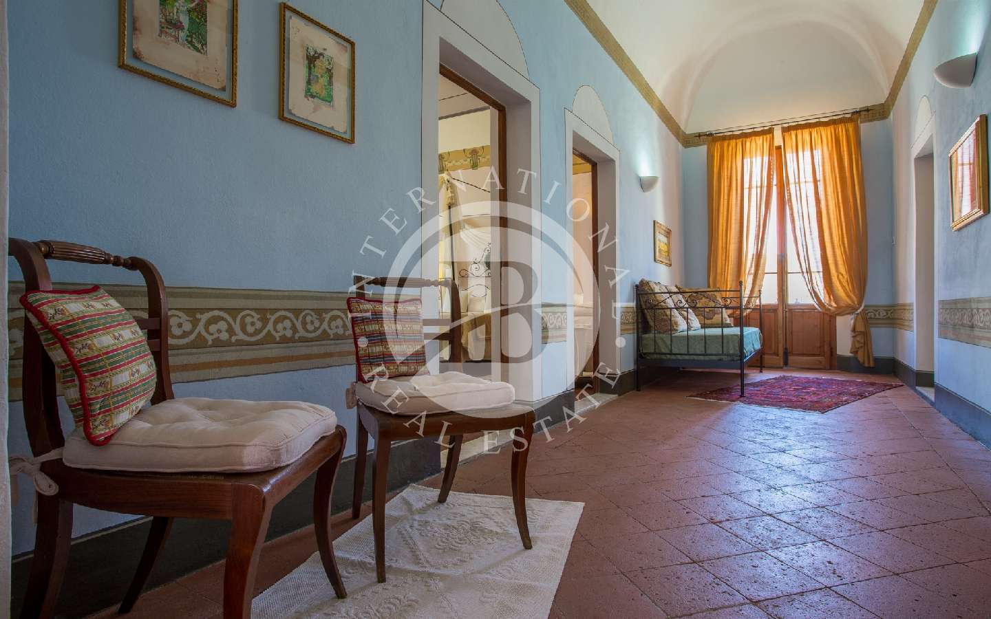 Attraverso una scala in ghisa e pietra, si accede al primo piano, composto da un corridoio che conduce a due camere matrimoniali (una delle quali con letto a baldacchino). Proseguendo lungo un altro corridoio, troviamo altre due camere doppie (trasformabili in matrimoniali). In tre camere è possibile aggiungere tre letti singoli. Inoltre, ci sono due bagni completi con doccia, di cui uno dotato di una comoda vasca da bagno. Ritornando al piano terra, prospiciente alla cucina e al soggiorno e raggiungibile da due porte ad arco, si trova un giardino con pavimentazione in pietra, più propriamente chiamato "Chiostra". Qui si trova un loggiato con tavolo e sedie, sotto il quale è possibile pranzare o rilassarsi su comodi divani, all'ombra di una pergola avvolta da un bellissimo glicine secolare.
