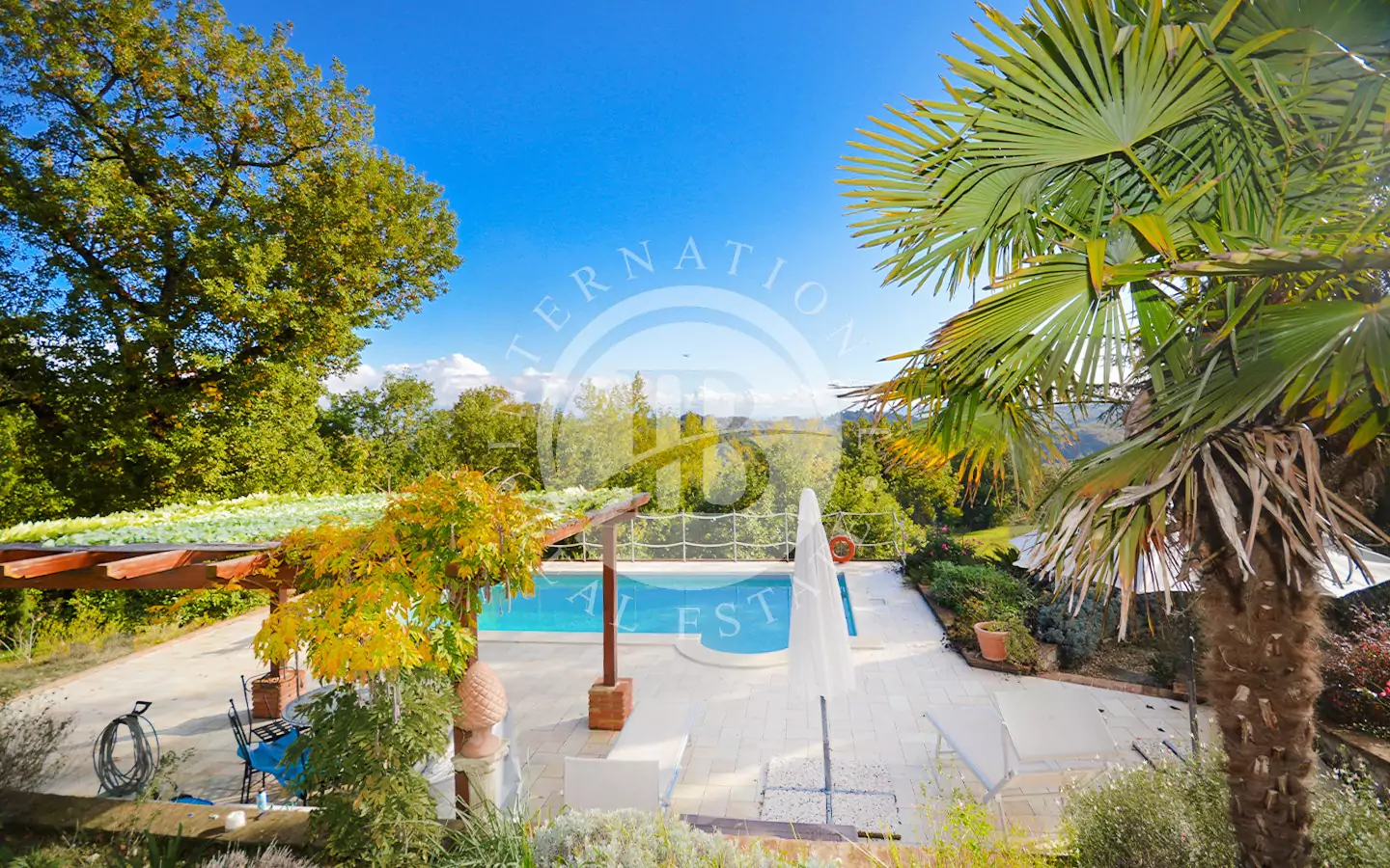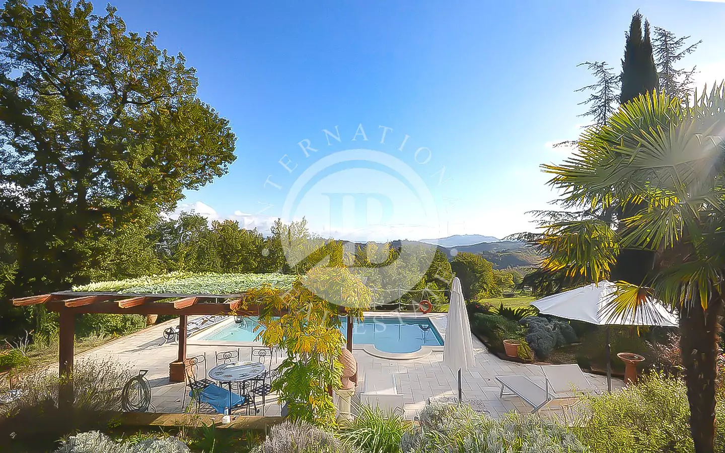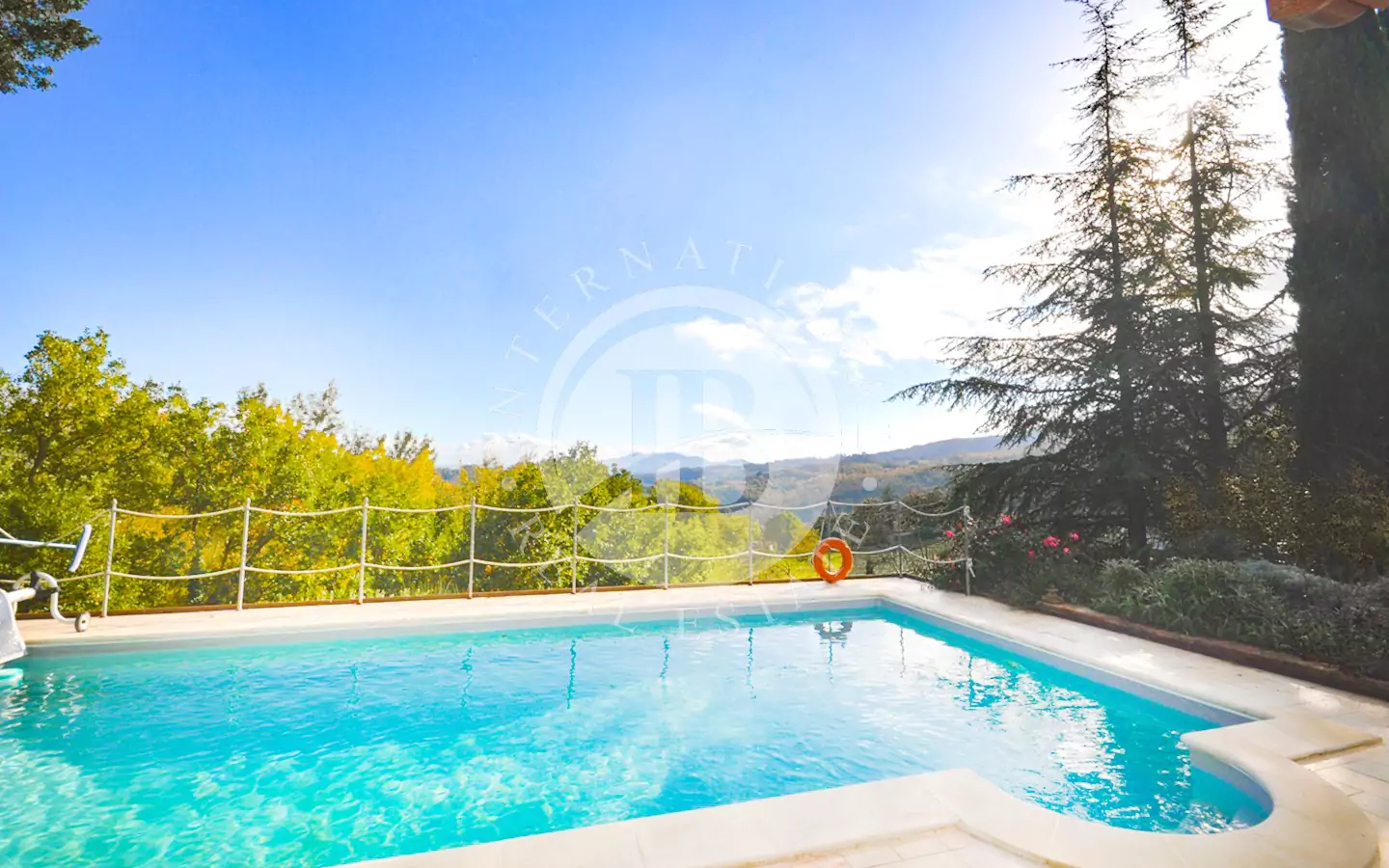 A pochi metri dalla casa, in posizione rialzata, si trova la piscina con solarium e doccia solare dalla quale è possibile ammirare un incantevole panorama sulla campagna umbra.