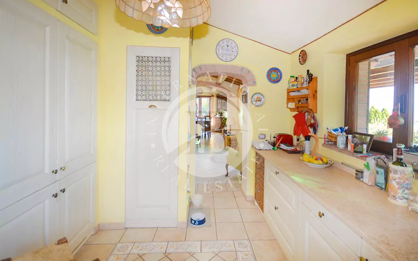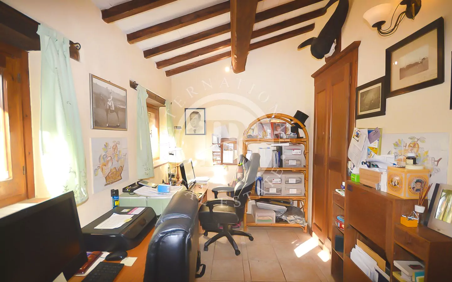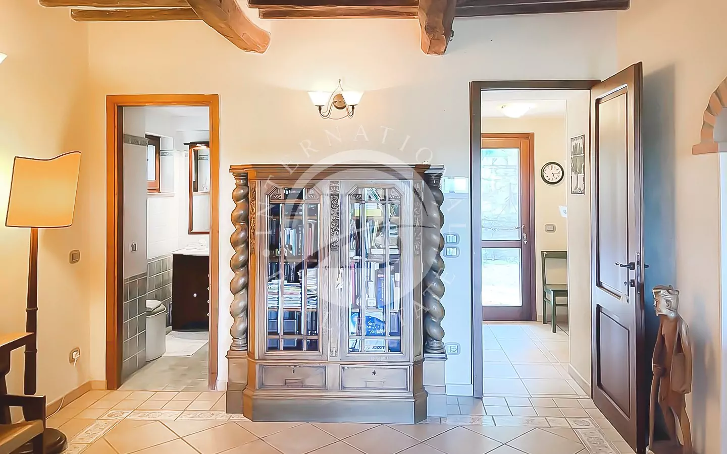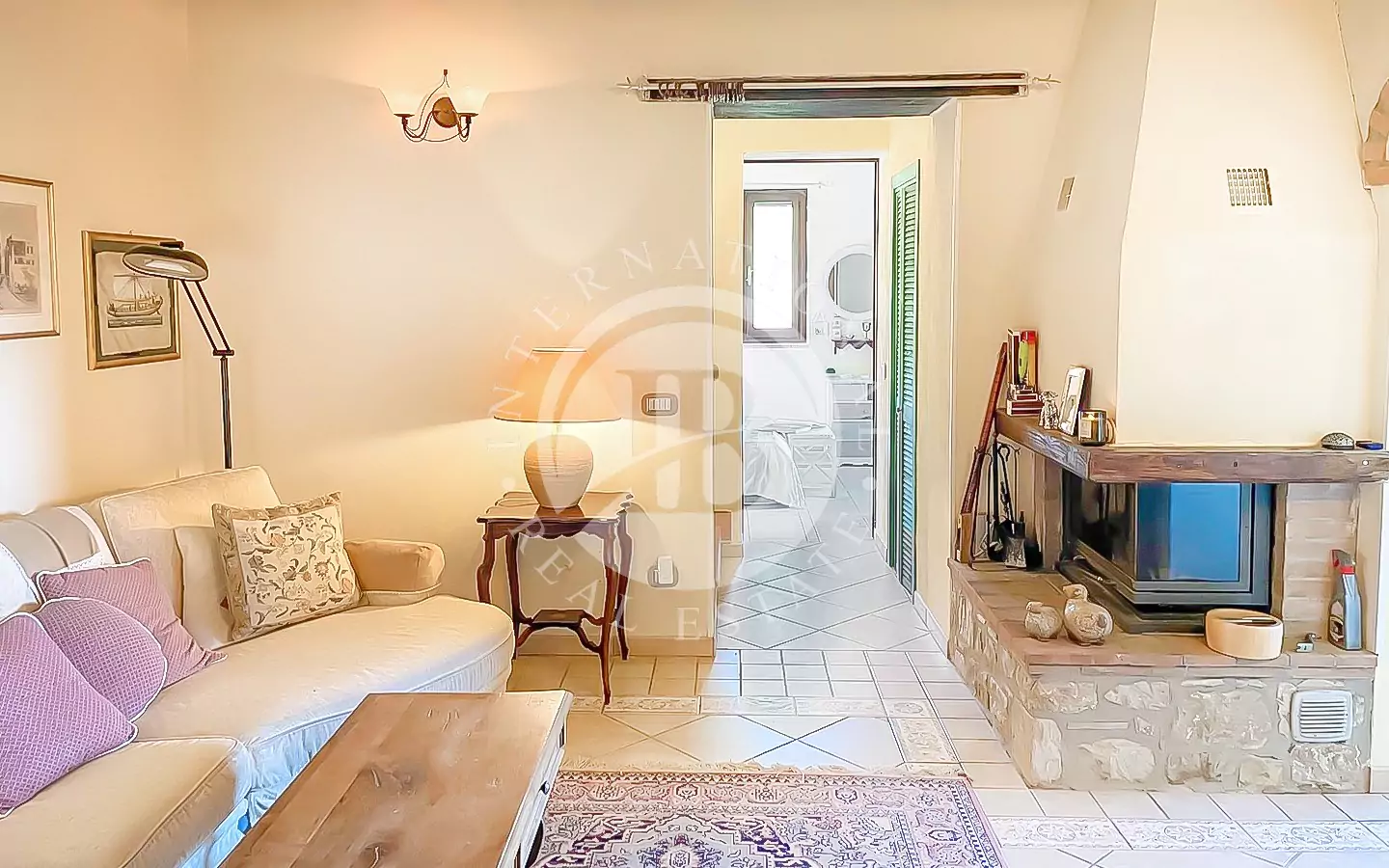 Ingresso, bagno di servizio, soggiorno, bagno con doccia, studio, sala da pranzo, salotto con camino, cucina, una camera da letto (letto una piazza e mezzo) e piccolo ripostiglio.
