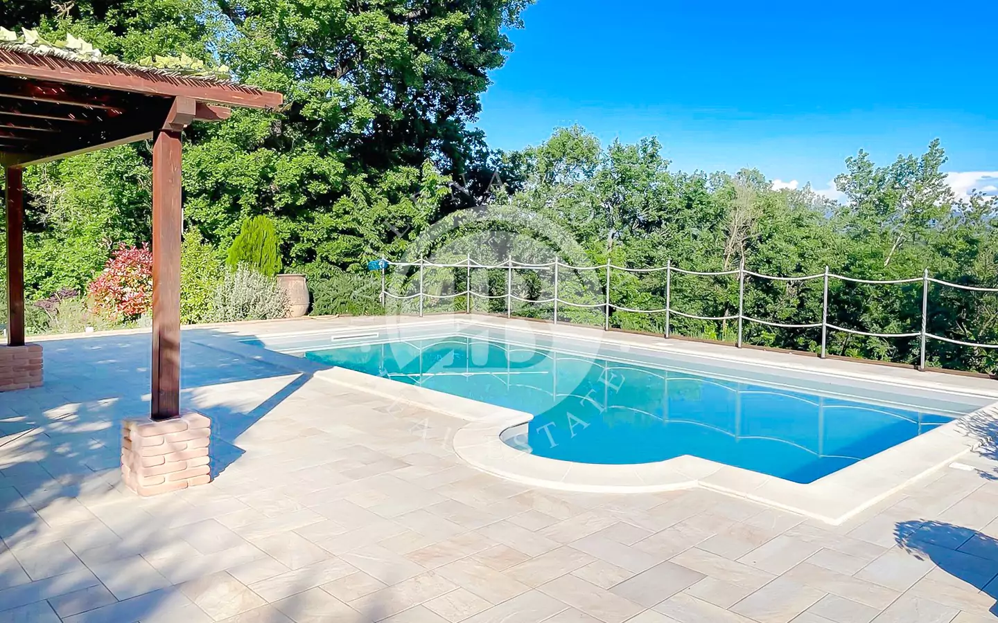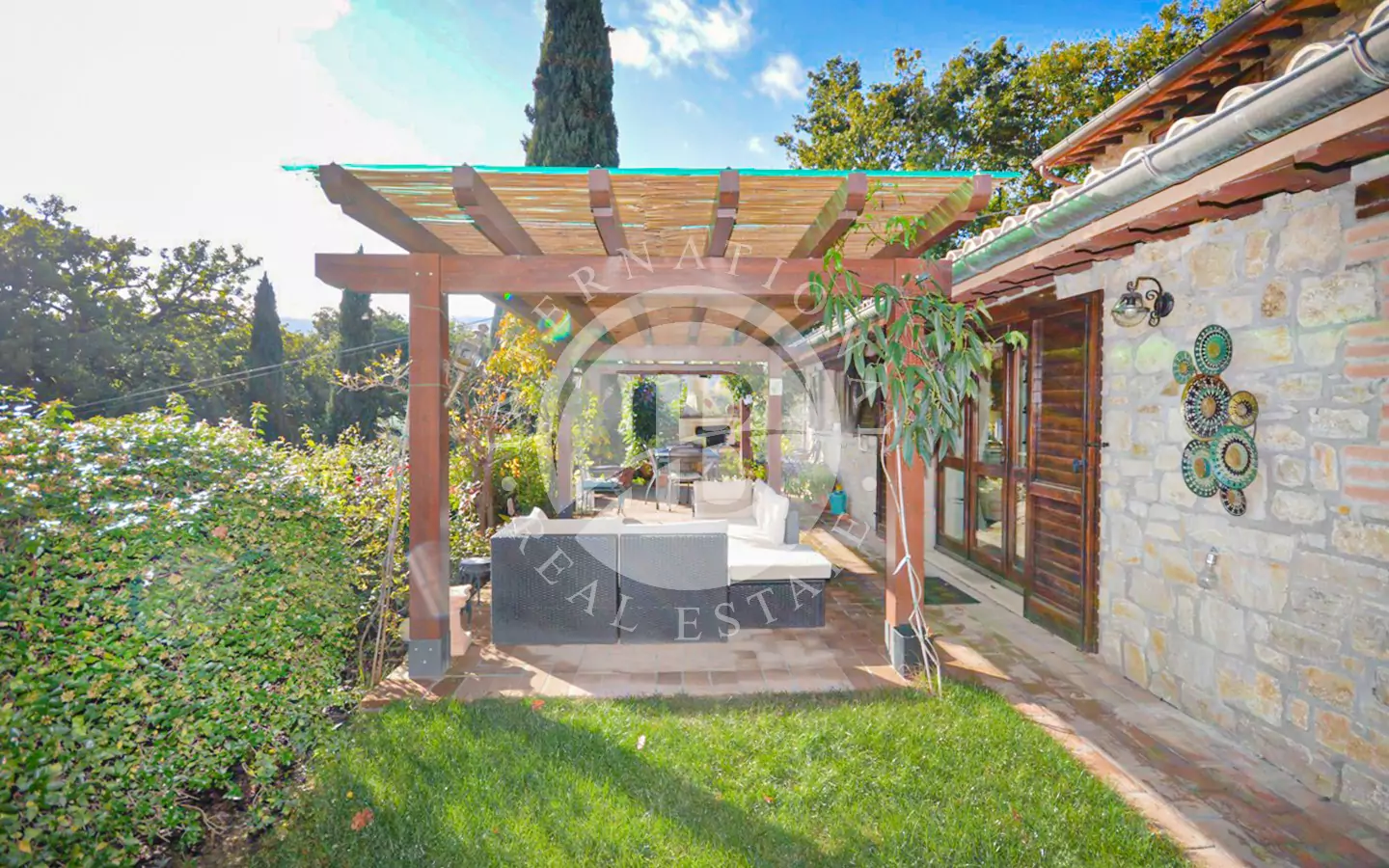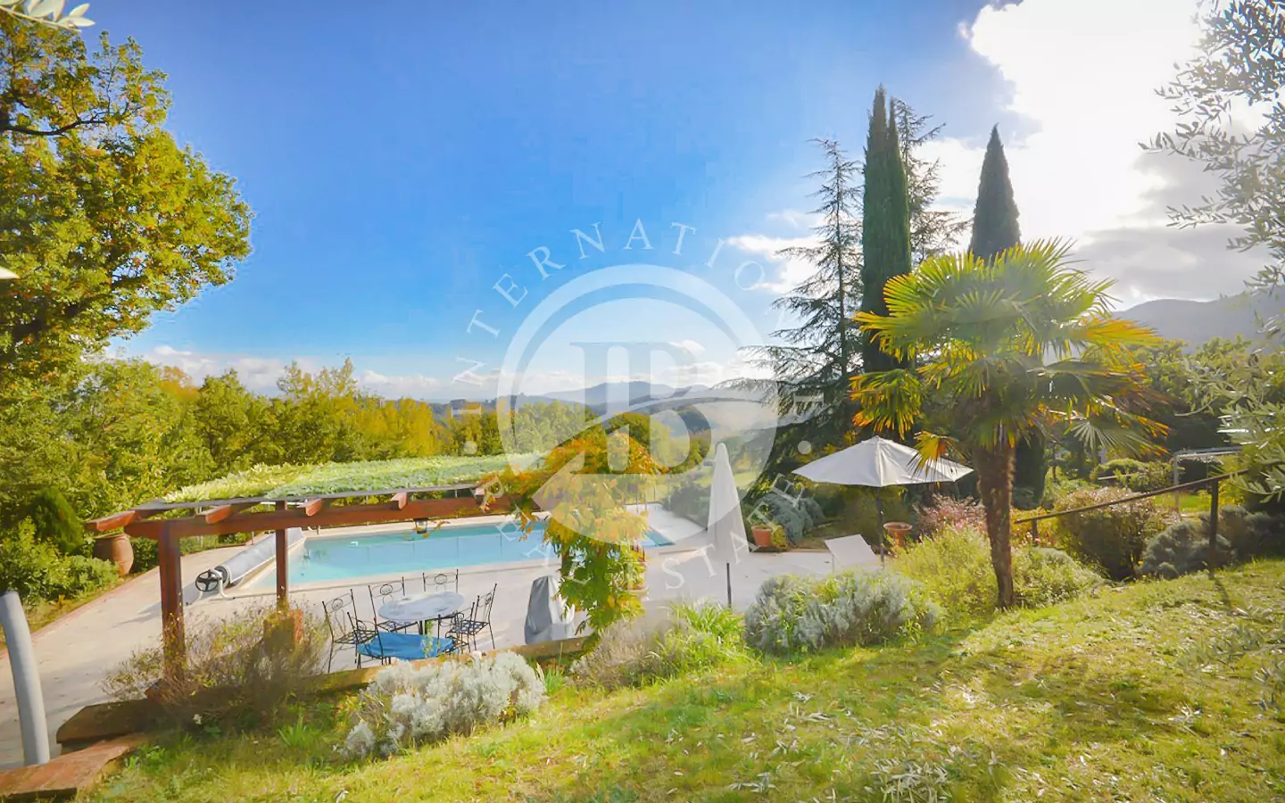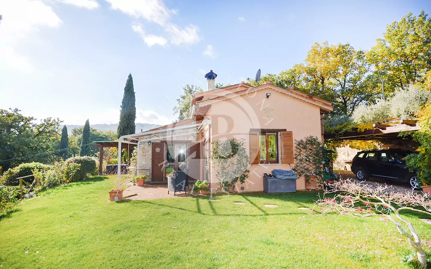 La proprietà dispone di circa 1 ettaro di terreno con ampio prato, cipressi, molte varietà di alberi e circa 100 piante di ulivo. Comprende anche un locale tecnico e una pool house (piccolo locale).