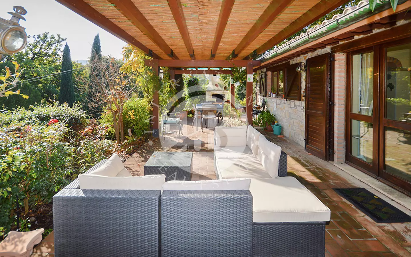 La zona giorno si apre su un portico con barbecue, ideale per mangiare all'aperto. Accanto alla zona giorno c'è una cucina completamente attrezzata.