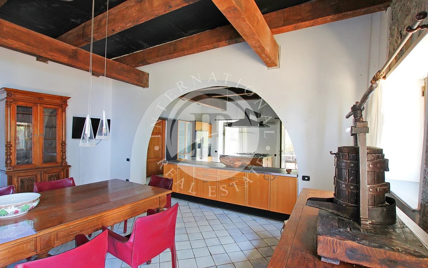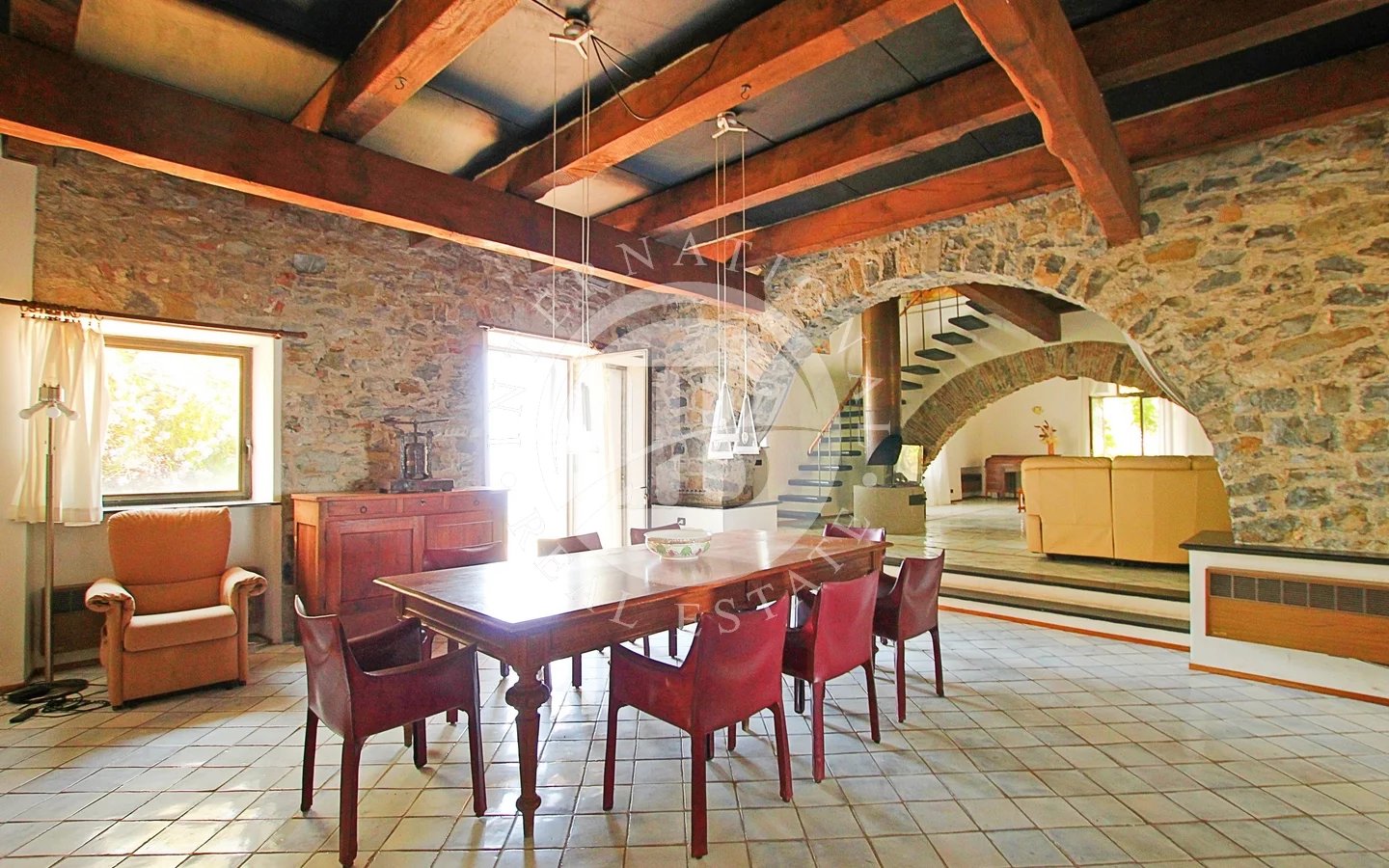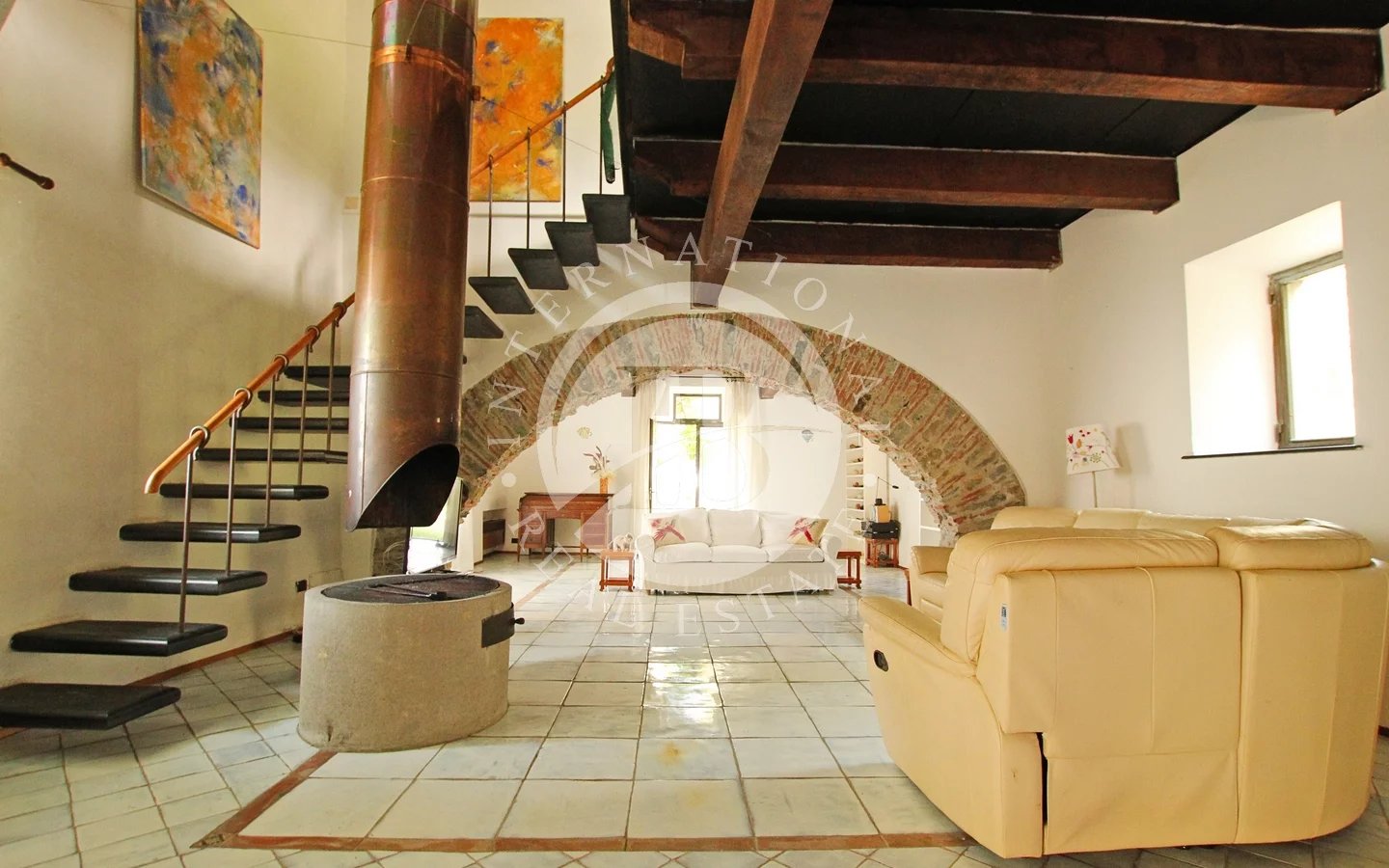 Un camino funzionante e di design, insieme ai pavimenti in marmo toscano fatti a mano e i soffitti in travi di legno e ardesia, conferiscono un tocco di eleganza.
