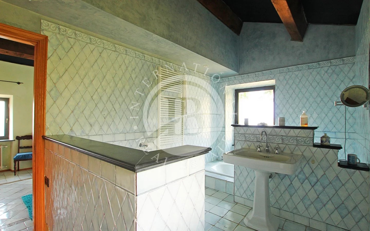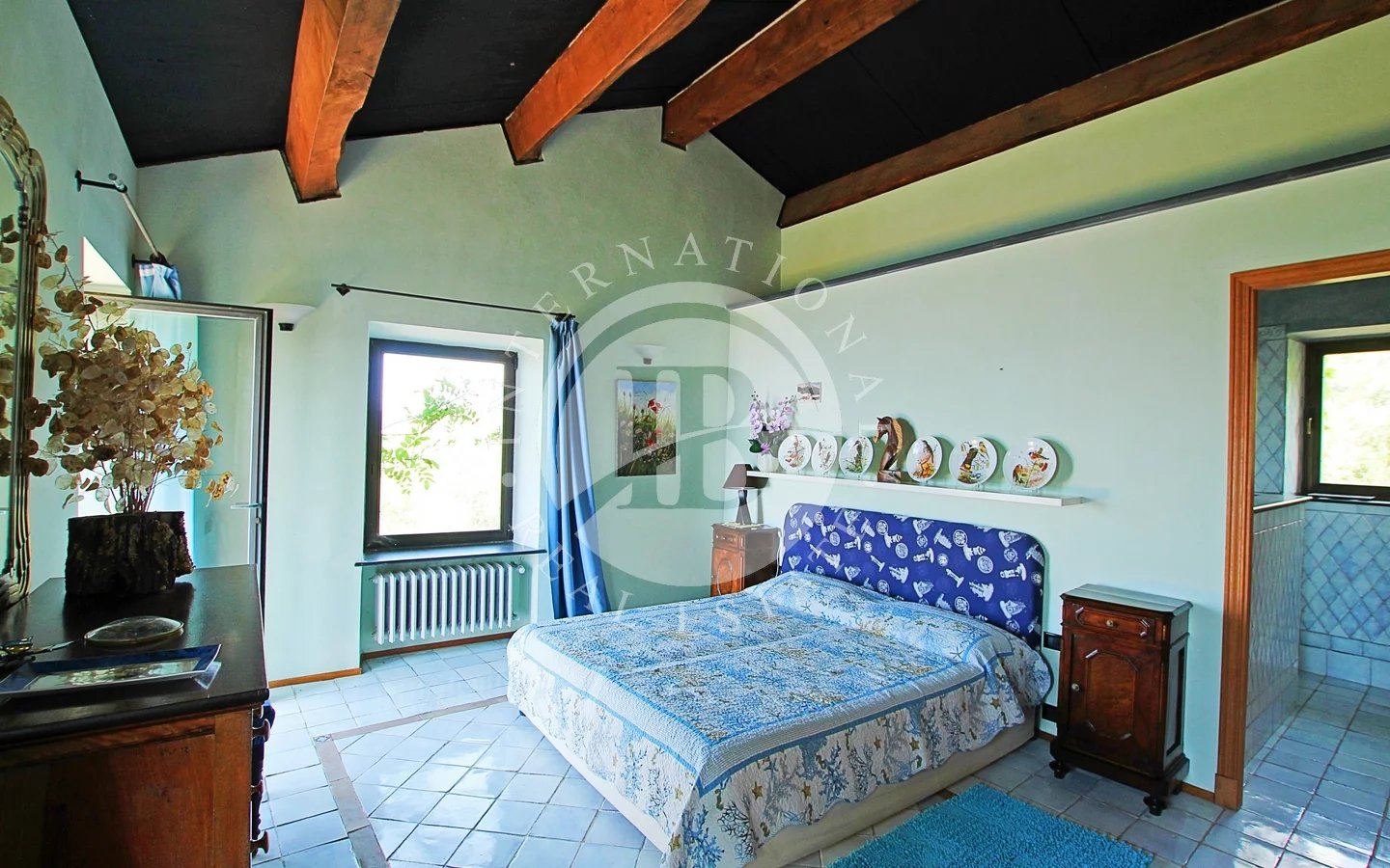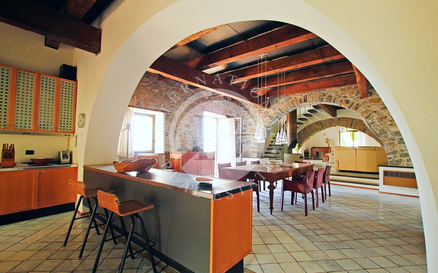 Un camino funzionante e di design, insieme ai pavimenti in marmo toscano fatti a mano e i soffitti in travi di legno e ardesia, conferiscono un tocco di eleganza.