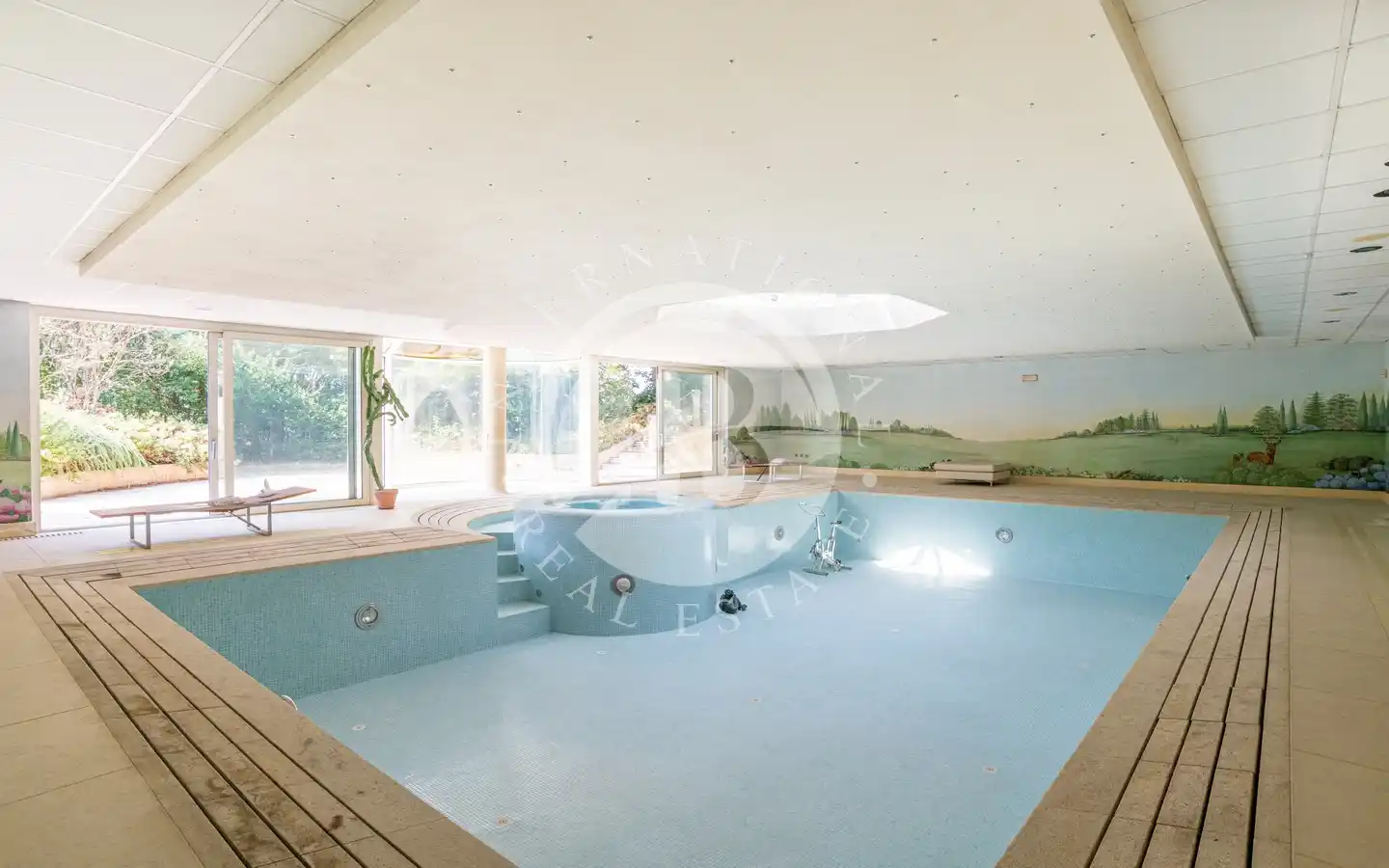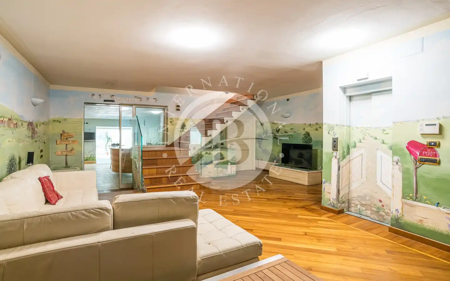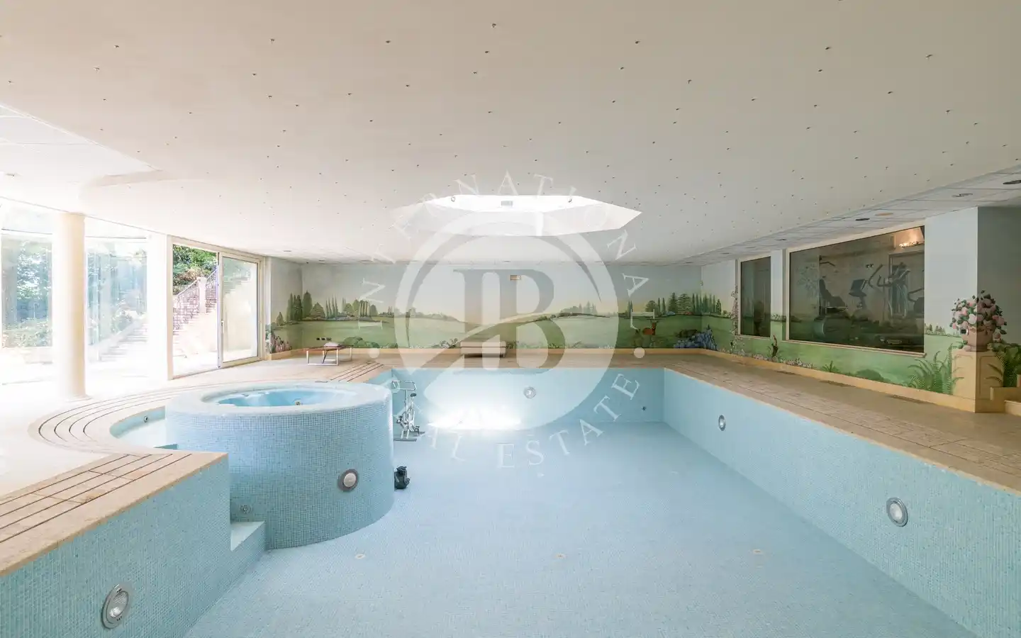 Il livello inferiore è dedicato al benessere, con una spaziosa area wellness dotata di palestra e piscina interna con accesso diretto al giardino. Sono inoltre presenti locali tecnici, una cantina e un’autorimessa di 250 mq.