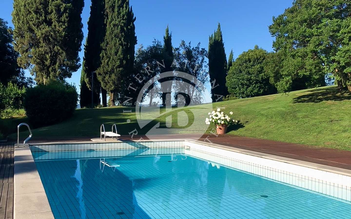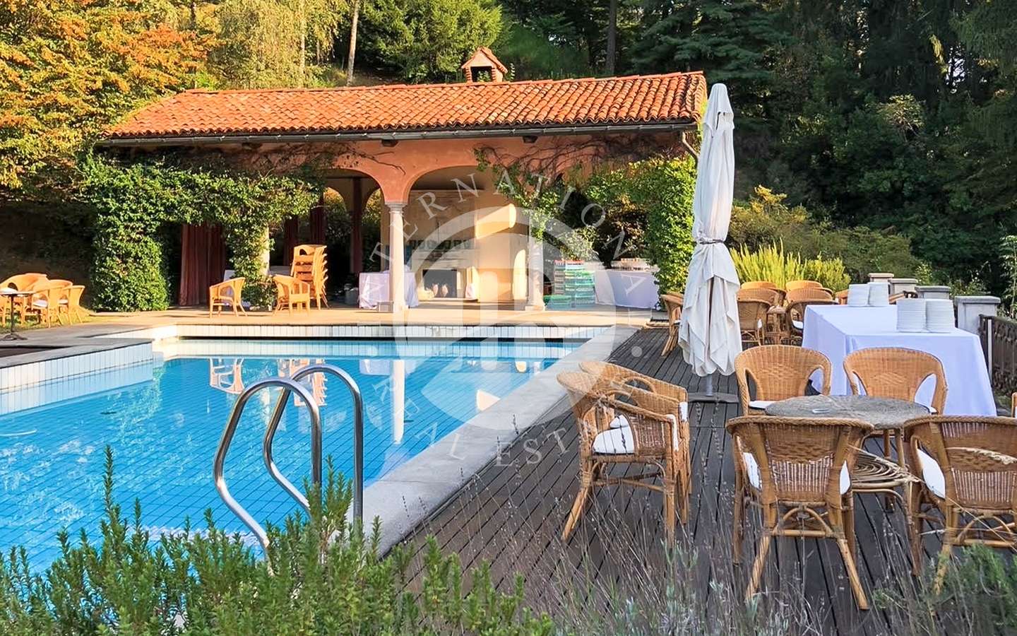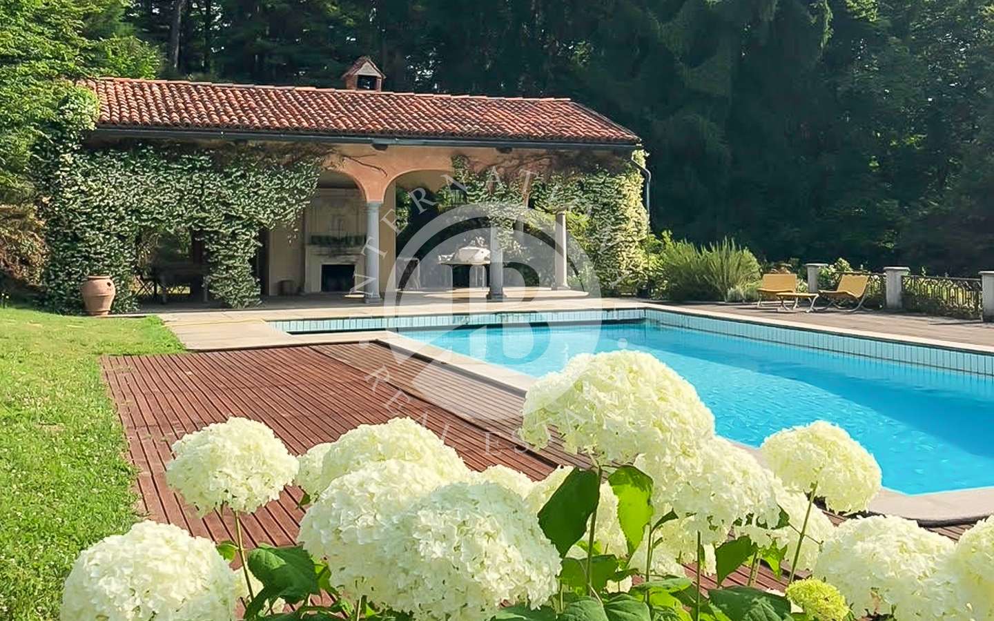 A completamento della proprietà, immersa nel bel giardino alberato, la pool house (130 mq) con tettoia aperta e piscina di 16,5 × 7,5 m, dotata di un comodo solarium e di una graziosa area relax attorno.