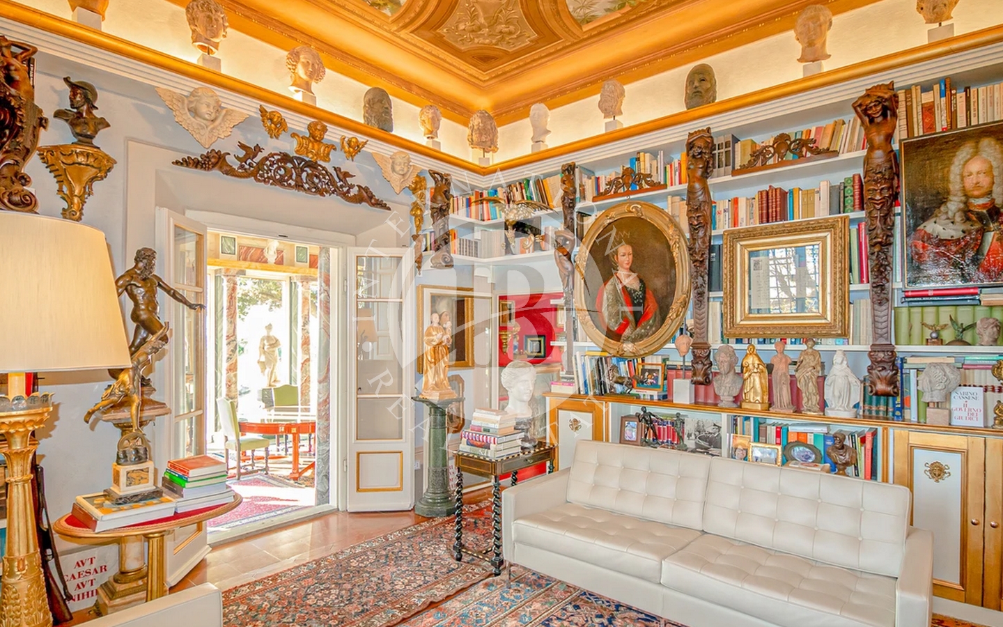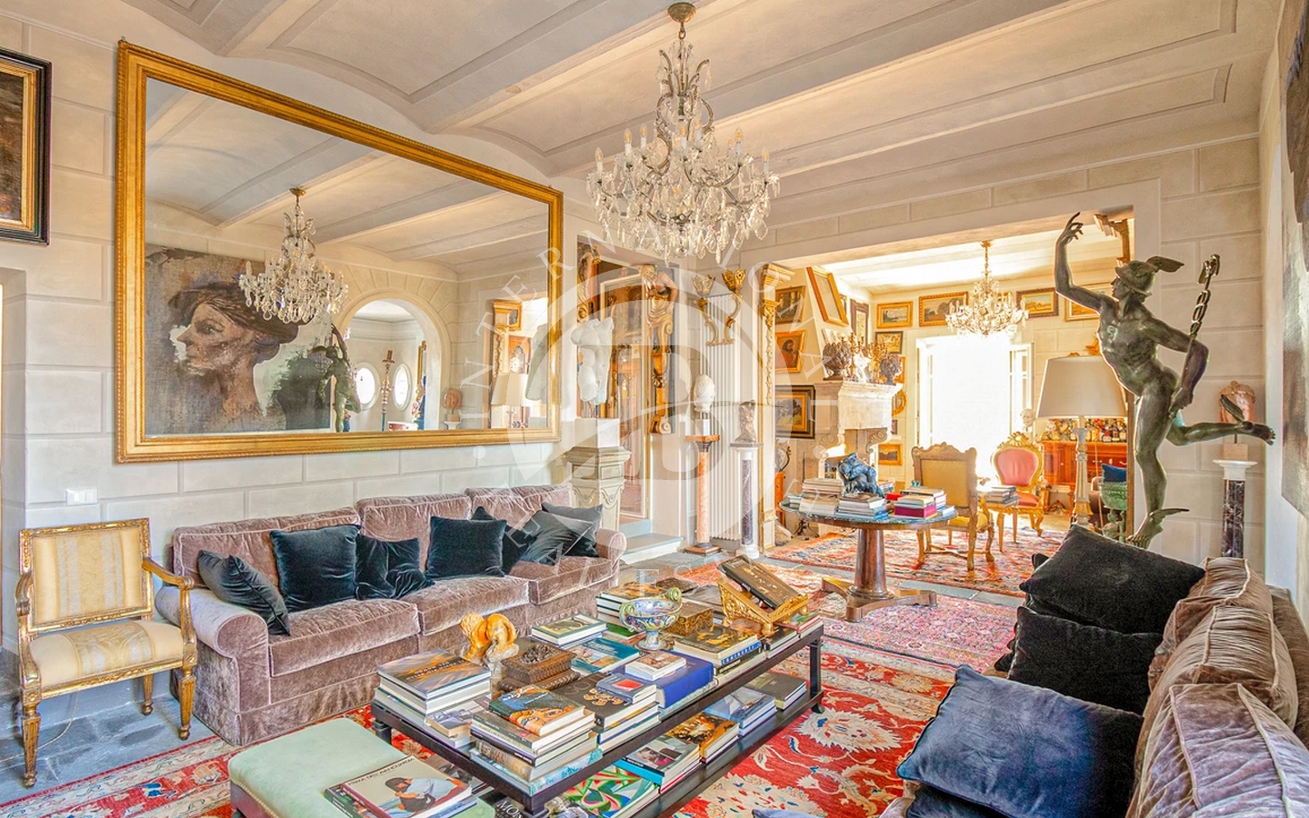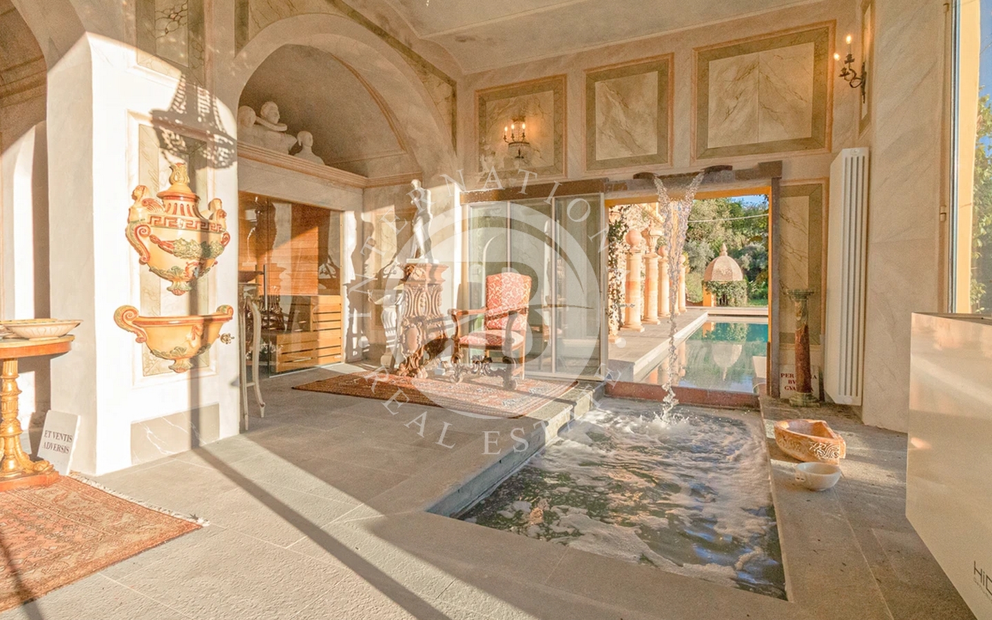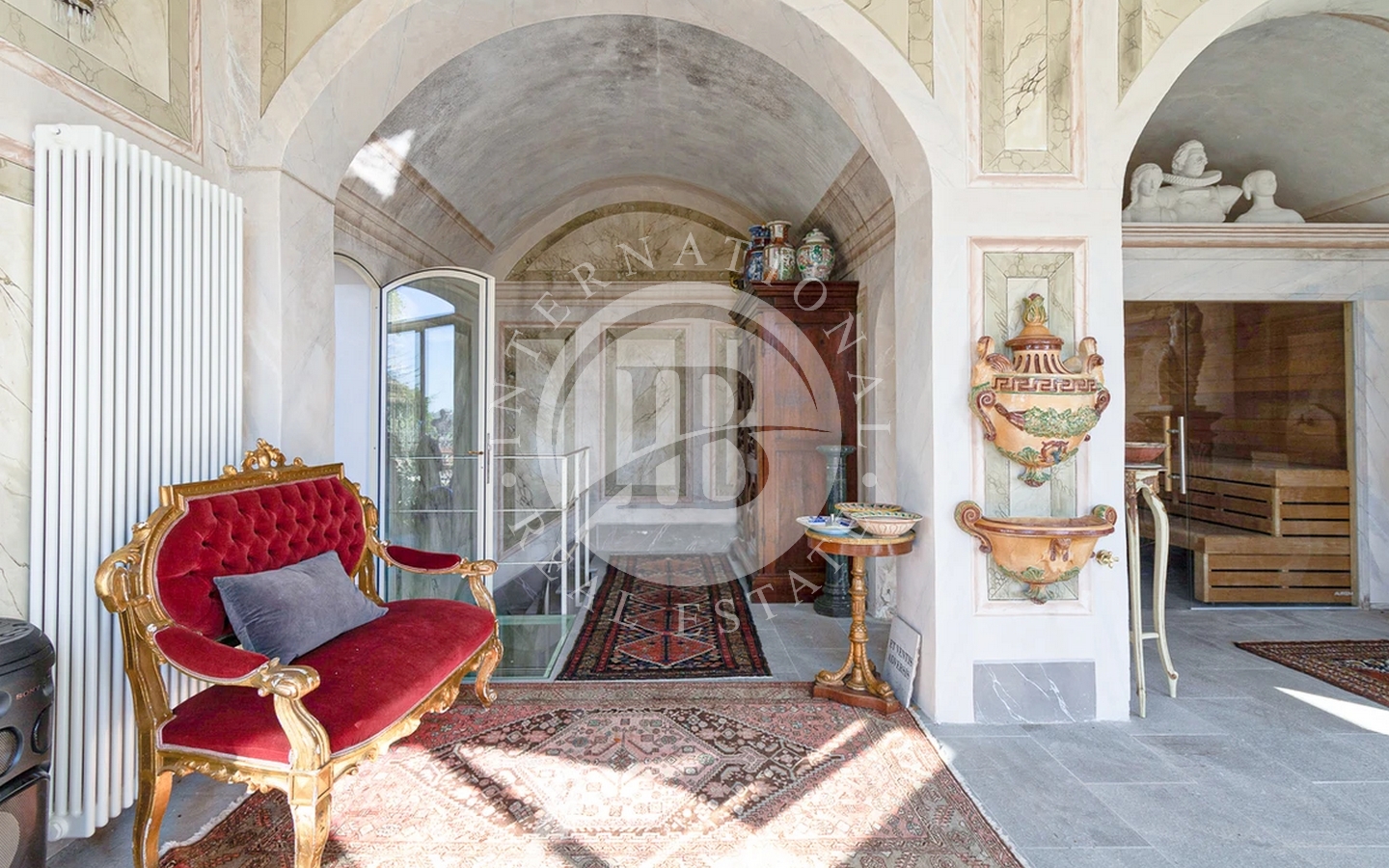 La villa principale, autentico museo di lusso, è un capolavoro di architettura e design. Gli interni si aprono con un doppio ingresso scenografico e una galleria di quasi 20 metri. Al piano terra, la Sala delle Colonne, di 90 mq, offre una vista impareggiabile sulla valle. Seguono una sala da pranzo, una biblioteca, una cucina decorata con maestria e due ampi saloni. I piani superiori ospitano sei camere da letto con bagni en suite, eleganti salotti, uno studio trasformato in sala cinema e una torretta con terrazzo panoramico. La villa è arricchita da oltre 300 opere d'arte, tra sculture, dipinti e tappeti, dal '400 al '900.