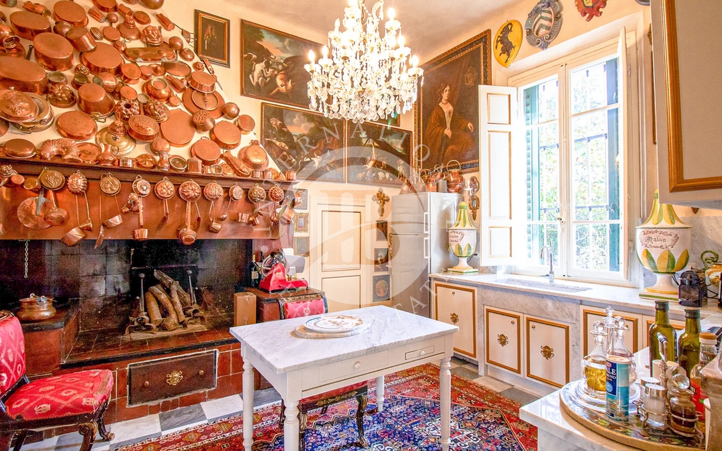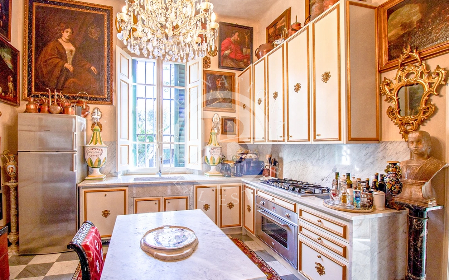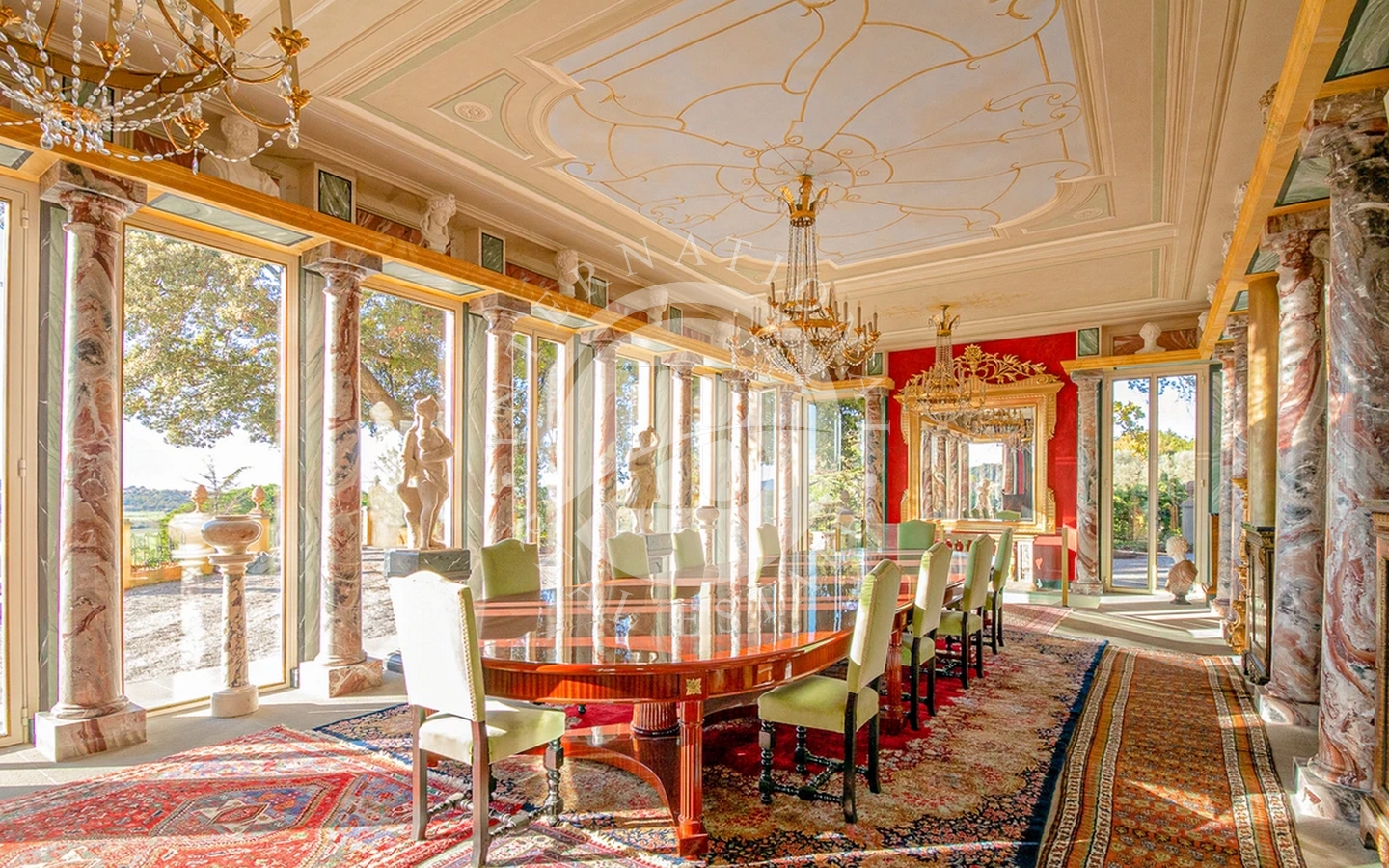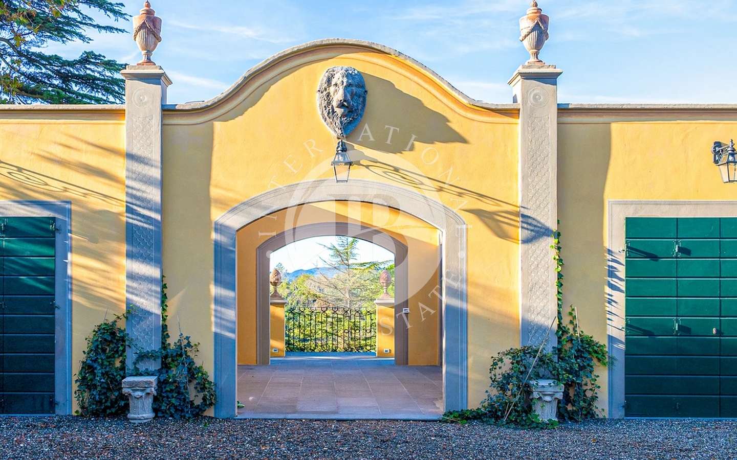 La villa principale, autentico museo di lusso, è un capolavoro di architettura e design. Gli interni si aprono con un doppio ingresso scenografico e una galleria di quasi 20 metri. Al piano terra, la Sala delle Colonne, di 90 mq, offre una vista impareggiabile sulla valle. Seguono una sala da pranzo, una biblioteca, una cucina decorata con maestria e due ampi saloni. I piani superiori ospitano sei camere da letto con bagni en suite, eleganti salotti, uno studio trasformato in sala cinema e una torretta con terrazzo panoramico. La villa è arricchita da oltre 300 opere d'arte, tra sculture, dipinti e tappeti, dal '400 al '900.
