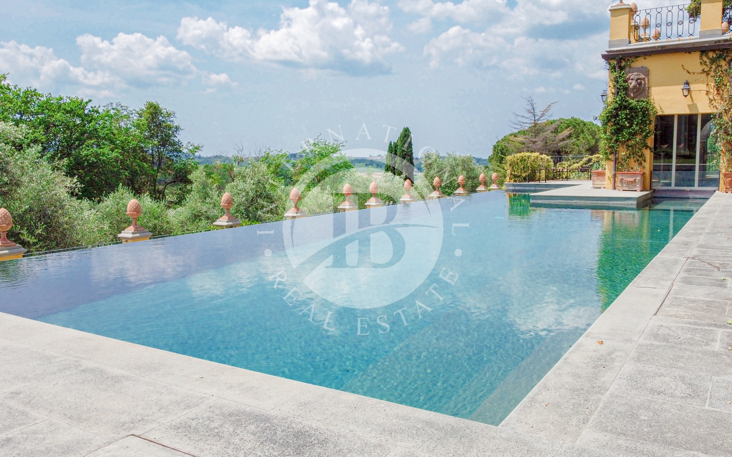 Gli esterni della proprietà comprendono un'infinity pool in pietra (20x6,5 metri) con idromassaggio e solarium, perfettamente inserita in un paesaggio bucolico. La SPA interna, con piscina riscaldata, sauna e idromassaggio, si affaccia su giardini all'italiana, prati all'inglese, laghetti e viali alberati. Circa 5 ettari sono dedicati a uliveti, vigneti e boschetti, inclusa la storica Vigna Christi, presente nel catasto leopoldino dal 1825. La proprietà comprende anche una vasta area boschiva e terreni agricoli per un totale di 32 ettari.