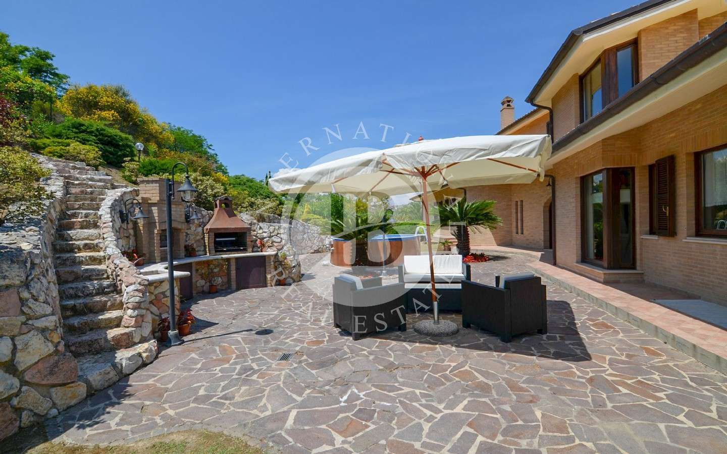 Den 2000 kvm stora trädgården omger villan och skapar en atmosfär av lugn och skönhet. En rustico med öppen spis och utekök ger charm till utomhusutrymmena. Ett 50 kvm stort garage i källaren och en 100 kvm stor veranda kompletterar fastigheten, som erbjuder en perfekt balans mellan elegans och funktionalitet.